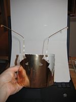 I put the braid trim on (the clothes pins are there while the glue dries), but I may have to take if off again if the spokes are not strong enough once all the beads are all on. It may be too heavy on the wire (the thickest I could find in gold). If the spokes fly around once their danglies are on, I'll have to start again with coat hangers and use the gold leafing pen. Wow I love that thing.